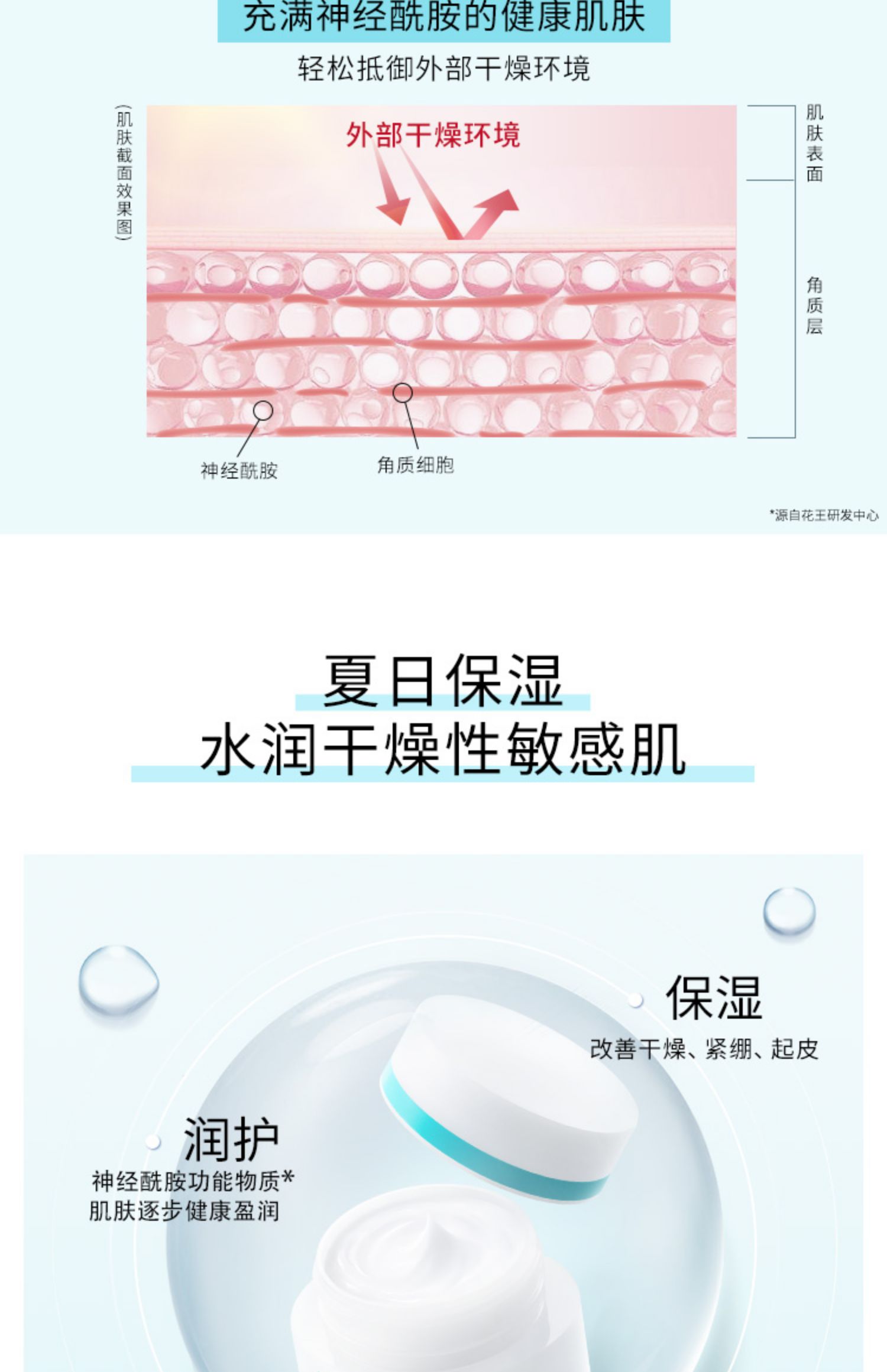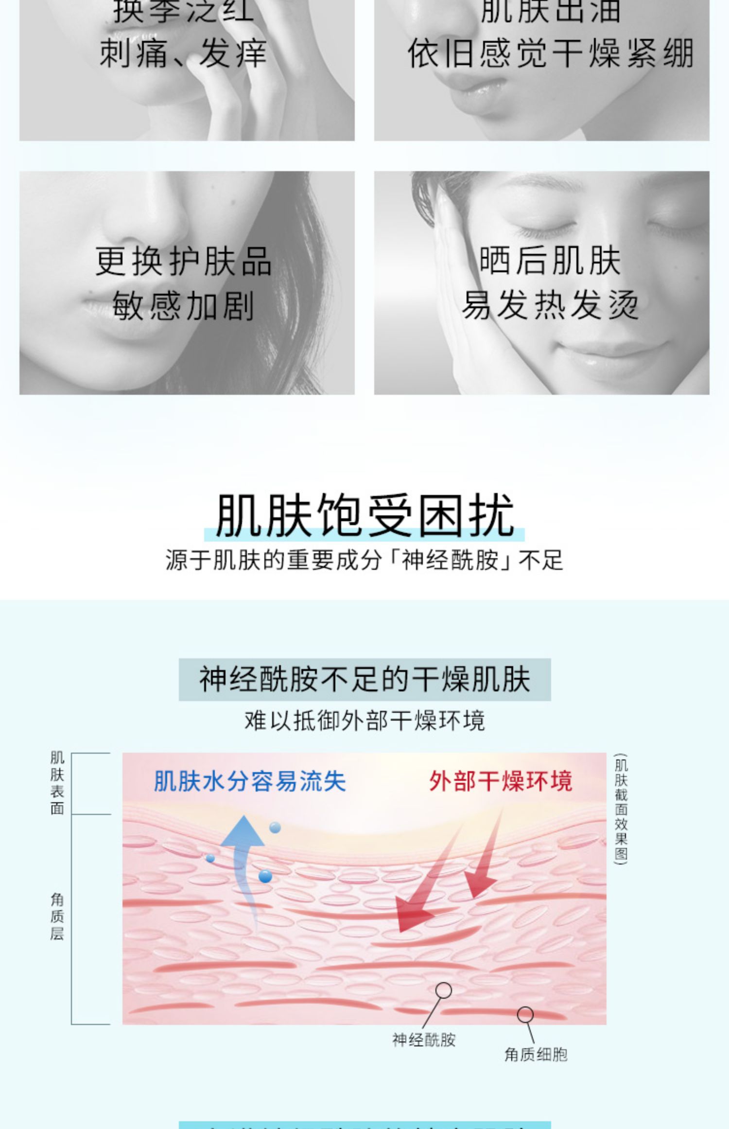 🌿🌿沉浸保湿神经酰胺护理成分,缓解干燥及敏感症状;添加了蓝桉叶提取物,提升肌肤内部的滋润功能;缓解干燥起皮的角质层症状。对修复皮脂膜有非常好的功效。